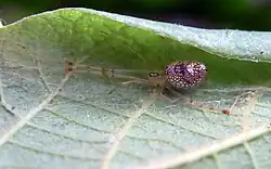 Thwaitesia argentiopunctata, also known as the sequinned spider, mirror spider, or twin-peaked Thwaitesia, is a species of spider found in the states of Australia. Body length for male is around 3 mm (0.12 in) while female body length is 4 mm (0.16 in).[1] The abdomen is attractively patterned with cream, green, yellow, and red.