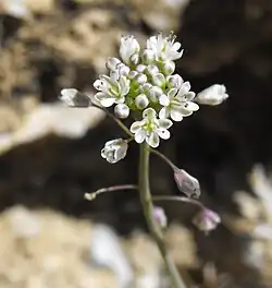Thysanocarpus laciniatus is a species of flowering plant in the family Brassicaceae known by the common name mountain fringepod.[1] It is native to California and Baja California, where it grows in many types of habitat. It is a common plant in much of its range. It is an annual herb producing a slender, branching or unbranched stem 10 to 60 centimeters tall. It is somewhat waxy in texture and generally lacks hairs. The leaves are linear to lance-shaped and smooth-edged or toothed. They measure up to 4 centimeters in length. The inflorescence is a raceme of small whitish or purplish flowers. The fruit is a flattened, rounded or oval disclike capsule with a thin wing around the edge.