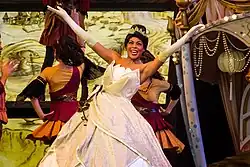 On October 26, 2009, "Tiana's Showboat Jubilee!" debuted with appearances from Tiana, Naveen, Louis, and Dr. Facilier, at the Walt Disney World Resort; and later at the Disneyland Resort. Tiana and Naveen are also in the "Festival of Fantasy Parade" at Magic Kingdom. Tiana, Naveen and Louis are also doing meet and greets at Walt Disney World's Liberty Square and in other parks in the Frontierland area aboard the riverboats. She joined Disney's "Once upon a Dream Parade" at Disneyland Paris in April 2010 as part of the "New Generations Festival". Tiana also joined Fantasmic! in early January 2010 during the finale with the Mark Twain Riverboat. Tiana, along with Naveen, Doctor Facilier, and Ray each make a cameo appearance in Disney's World of Color at Disney California Adventure. In Magic Kingdom Tiana and the other Disney Princesses can be found at Princess Fairytale Hall.[31][32] When visiting Magic Kingdom visitors could originally find Princess Tiana under a gazebo at the edge of Liberty Square. Since June 2016, Tiana has been doing meet-and-greets at Princess Fairytale Hall.[33]