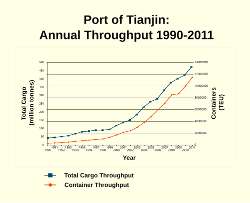 Tianjin Port handled 500 million tonnes of cargo and 13 million TEU of containers in 2013,[10] making it the world's fourth largest port by throughput tonnage and the ninth in container throughput.[11] The port trades with more than 600 ports in 180 countries and territories around the world.[3] It is served by over 115 regular container lines[12] run by 60 liner companies, including all the top 20 liners. Expansion through the turn of the twenty-first century was enormous, going from 30 million tonnes of cargo and 490,000 TEU[13] in 1993 to well beyond 400 million tonnes and 10 million TEU in 2012.[14] 550–600 Mt of throughput capacity was expected by 2015. The large volume of port traffic and high urban population makes Tianjin a large-port megacity, the largest type of port-city in the world.[15]