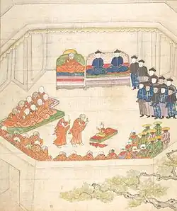 The office of the two Ambans was set up in 1728. They were imperial residents of the Qing dynasty and reported to the Qing government agency known as the Lifan Yuan. Prior to that there were no permanent representatives of the Qing emperor in Tibet and the temporary representative after 1720 was withdrawn in 1723. Between 1723 and 1728, there were special missions to Lhasa but no permanent residence. The fact that two ambans with their Chinese garrison have been stationed in Lhasa since 1728 is significant because it shows that Manchu China had effectively taken over the position of the former Mongol protector of the lamaist regime.[56] There was a senior and junior amban but the distinction was purely formal and they both held the same authority. Between the death of A'erxun in 1734 and 1748, there was only one amban. The first two ambans, Sengge and Mala, held office for five years, but thereafter ambans held office for a maximum of three years. During the rule of Polhané, the ambans' duties mainly consisted of commanding the Qing garrison and communications with Beijing on the actions of the Tibetan ruler. During the initial period they sometimes intervened in matters of foreign relations but they never interfered with the Tibetan government at that time. In 1751, the power of the ambans was increased. Besides their former duties, their directions also had to be taken by the Kashag on every important matter, giving them broad supervision over the Tibetan government. Direct intervention by the ambans was still a rare occurrence until after the Sino-Nepalese War in 1792.[51] By 1793, the ambans were accorded the same rank as the Dalai and Panchen Lamas, and these two high-ranking Lamas were denied the traditional right of communicating directly with the Emperor; they could only do so via the ambans. By this time the ambans were also above the Kashag and regents in regards to Tibetan political affairs. Over a period of 184 years, the amban's status changed from consultative to supervisory and finally to commanding official in Lhasa.[57] The staff of the ambans included one or two military officers and several clerics. The clerics' function was probably similar to that of secretaries. After 1751, a number of Manchu banner officers were added.[58]