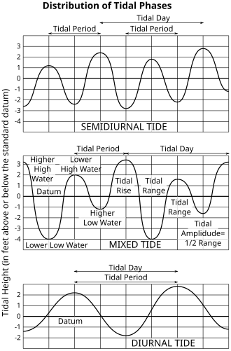 Tidal energy is taken from the Earth's oceanic tides. Tidal forces result from periodic variations in gravitational attraction exerted by celestial bodies. These forces create corresponding motions or currents in the world's oceans. This results in periodic changes in sea levels, varying as the Earth rotates. These changes are highly regular and predictable, due to the consistent pattern of the Earth's rotation and the Moon's orbit around the Earth.[7] The magnitude and variations of this motion reflect the changing positions of the Moon and Sun relative to the Earth, the effects of Earth's rotation, and local geography of the seafloor and coastlines.