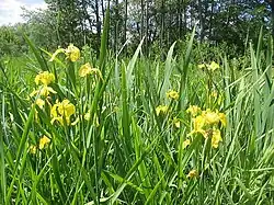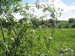 The flooded tall sedge meadows that long dominated the Tiefwerder Wiesen are declining due to increasingly infrequent flooding. However, the riparian sedge, growing up to two meters tall, can still be found along the water bodies' edges. Instead, the wet meadow areas and fallows are now characterized by slender sedge meadows from the sedge genus. The main plant in this community is the slender sedge, a perennial, herbaceous plant that can reach heights between 30 and 150 cm. In the siltation areas, it is joined by the bladder sedge, which is endangered in Berlin[15] and occasionally forms a hybrid with the slender sedge. The slender sedge reed has a long survival capacity with increasing drainage but is displaced by reed canary grass in areas of better-aerated soils. Extensive water swath reeds, also known as giant swaths or sweetgrass, dominate the wetter parts of the meadow, often forming pure stands. These sweetgrass plants can grow up to two meters high. From May to July, the cuckoo campion adds pink flowers and stands up to 60 cm tall in the sedge and reed-rich areas of the meadow. Pennywort and yellow-flowered marsh marigolds also bloom in this period, while the marsh marigold might also have a weaker second flowering phase between July and October. Later in the season, the meadow rue with yellow buttercups (June to August) and poison buttercups, especially in June, contribute to the yellow flowering display. From July to September, the dark purple flowers of the marsh thistle add contrast to the yellow blooms.[6][16] In early summer, wild rose shrubs like the dog rose showcase many light pink flowers along the paths and shrubbery edges.