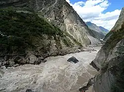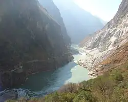 Tiger Leaping Gorge (Chinese: 虎跳峡; pinyin: Hǔ tiào xiá) is a scenic canyon on the Jinsha River, a primary tributary of the upper Yangtze River. It is located 60 kilometres (37 mi) north of Lijiang City, Yunnan in southwestern China. It is part of the Three Parallel Rivers of Yunnan Protected Areas World Heritage Site.