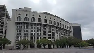 In 1936 capacity was more than doubled with 24,000 seats in the north end zone, turning the stadium into a horseshoe. Money was not allocated in the state budget for the seating expansion, but money was allocated for dormitories. According to local legend, Governor Huey P. Long, who had always taken a personal interest in LSU, ordered that dormitories be built in the stadium, with seating above the student living quarters.[16] However, in a 2015 ESPN story, Bud Johnson, at the time director of LSU's athletics museum and also a former LSU sports information director, said that the idea actually came from LSU's athletic director T. P. "Skipper" Heard, while "the governor helped in other ways."[17] Until the late 1980s, the West, North and South Stadium dormitories were featured as part of student housing at LSU, and the football team even lived in them during the 1986 season while the athletic dormitory was being renovated.[17] The dormitories were later converted to office space for Athletic Department staff and faculty and studios for the College of Art & Design's Fine Arts graduate students, but by 2015 were no longer used.[17]