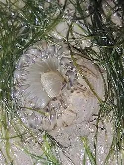 The tiger anemone (Macrodactyla fautinae) is a species of sea anemone native to marine habitats near Singapore.[1][2] Previously sighted before it was first described as a new species in 2023, M. fautinae has also been commonly referred to as the purple-lip sand anemone by local residents.[3] The species is named in honor of Daphne Gail Fautin, who was an American zoologist and professor at the University of Kansas.[4]