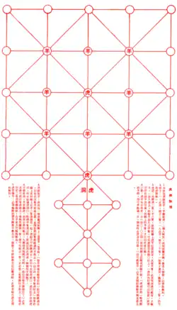 The tiger game is a traditional Chinese board game. It is a strategy game for two players. One player, who plays the tiger, has only one piece. The other player has 18 men. The tiger must eat the men, who must block the tiger so that he cannot move. The game can be played with any kind of pieces that can be distinguished from one another. The board is 8×8 squares, with the addition of a square of 2×2 squares, which is called the tiger's lair.