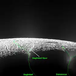 The name tiger stripes is an unofficial term given to these four features based on their distinctive albedo. Enceladean sulci (subparallel furrows and ridges), like Samarkand Sulci and Harran Sulci, have been named after cities or countries referred to in The Arabian Nights. Accordingly, in November 2006, the tiger stripes were assigned the official names Alexandria Sulcus, Cairo Sulcus, Baghdad Sulcus and Damascus Sulcus (Camphor Sulcus is a smaller feature that branches off Alexandria Sulcus).[5] Baghdad and Damascus sulci are the most active, while Alexandria Sulcus is the least active.