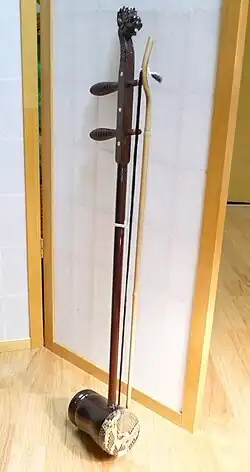 The tihu (提胡; pinyin: tíhú) is a two-stringed bowed vertical fiddle in the huqin family, used in Chaozhou xianshi music of the Chaozhou people. It is an adaptation of the gaohu used in Cantonese music. It has a tubular hardwood body that is covered on the playing end with python skin. It is used in the Chaozhou people's original homeland of Chaozhou and Shantou, in eastern Guangdong, as well as in regions where Chaozhou people have immigrated, such as Thailand and Singapore.