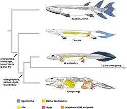 - ^ a b c Stewart, Thomas A.; Lemberg, Justin B.; Taft, Natalia K.; Yoo, Ihna; Daeschler, Edward B.; Shubin, Neil H. (2019). "Fin ray patterns at the fin-to-limb transition". Proceedings of the National Academy of Sciences. 117 (3): 1612–1620. doi:10.1073/pnas.1915983117. PMC 6983361. PMID 31888998.