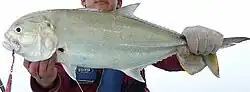 The tille trevally is a large species, growing to a maximum known length of 80 cm and a recorded weight of 7.3 kg.[2] It is similar in general appearance to most jacks in the genus, having a compressed, oblong body, with the dorsal profile more convex than the ventral profile, particularly anteriorly. This curvature gives the fish a discernibly 'blunt' head and steep snout, which is the most obvious identifying feature of the species.[7] The dorsal fin is in two distinct sections; the first consists of eight spine and the second of one spine and 20 to 22 soft rays. The anal fin consists of two anteriorly detached spines followed by one spine and 16 to 18 soft rays,[8] while the pelvic fins have one spine followed by 18 soft rays. The lateral line is moderately arched anteriorly, with 53 to 54 scales in this section, while the straight section contains none to two scales and 33 to 42 strong scutes. The breast is completely scaled.[9] The species has well-developed adipose eyelids, while its dentition consists of an outer row of widely spaced canines and an inner band of villiform teeth in the upper jaw, with a row of widely spaced conical teeth on the lower jaw. The tille trevally has 22 to 25 gill rakers and 24 vertebrae.[7]