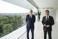 In August 6, 2025, Cook visited Donald Trump at the White House, presenting him with a glass plaque set in a 24-karat gold base made from American materials. Cook announced an additional $100 billion in U.S. investments, bringing Apple's total commitment to $600 billion, as part of the company's strategy to align with Trump's "America First" policies and avoid potential tariffs on semiconductors.[82][83]