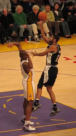 On July 16, 2003, Duncan signed a seven-year, $122 million contract with the Spurs.[61] Before the 2003–04 season began, the Spurs lost their perennial captain David Robinson to retirement. Embracing the lone team leader role, Duncan led a reformed Spurs team which included Slovenian center Rasho Nesterović, defensive stalwart Bruce Bowen, Argentinian shooting guard Manu Ginóbili and young French point guard Tony Parker. Coming off the bench were clutch shooting power forward Robert Horry, versatile Hedo Türkoğlu and veterans Malik Rose and Kevin Willis.[62] In retrospect, Robinson commented that at first, Duncan was reluctant to step into the void, still needing some time to truly develop his leadership skills.[63] Statistically though, Duncan remained strong; after another convincing season with averages of 22.3 points, 12.4 rebounds, 3.1 assists and 2.7 blocks,[7] he led the Spurs into the Western Conference Semifinals. There, they met the Los Angeles Lakers again, split the series 2–2, and in Game 5, Duncan made a toughly defended jump shot which put the Spurs ahead by one point with 0.4 seconds left to play. Despite the little time remaining, Lakers point guard Derek Fisher hit a buzzer beater, giving his team the win.[64][65] In the end, the Spurs lost the series 4–2, and Duncan attributed the strong Lakers defense as one of the reasons for the loss.[66]