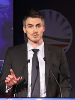 Tim Harris (born c. 1979) is a South African politician, a former Democratic Alliance member of the National Assembly, and a Parliamentary Counsellor to Mmusi Maimane, the Leader of the Opposition. He served as Shadow Minister of Finance from 2012 to 2014, and was succeeded by Dion George. A former chief of staff to party leader Tony Leon,[1] Harris was the party's national events manager during the 2009 general election campaign, and was subsequently elected to Parliament aged 29, initially to the National Council of Provinces where he served as the Western Cape's Provincial Whip before being moved to the National Assembly in a Shadow Cabinet reshuffle.[2] He has been characterised as the "sexiest man in politics".[3]