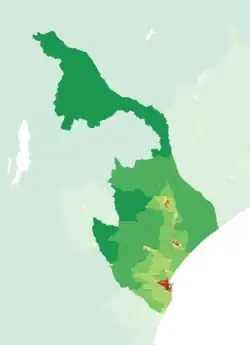 Timaru District covers 2,732.41 km2 (1,054.99 sq mi)[1] and had an estimated population of 49,500 as of June 2024,[2] with a population density of 18.1 people per km2.