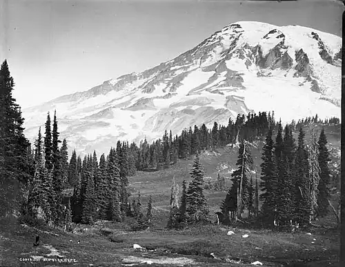 The first settler upon the slopes of Mount Rainier itself was James Longmire, an American who came to Washington Territory in 1853 with his family via the overland Naches Pass route.[4][8][9] Longmire and his family settled in Yelm, Washington, in the valley below Mount Rainier.[4][8] His home became a launching point for a number of exploratory trips to Mount Rainier.[4][8] In the 1860s, Longmire was involved in surveys of the Nisqually River region at the base of Mount Rainier leading to his eventual employment as a guide for the 1870 ascent of Mount Rainier.[4][8] Longmire would go on to locate a mineral claim at the base of Mount Rainier, leading to an increase of prospectors to the region and eventually an increase in tourists after, with the aid of some local American Indians, they cleared a road from the Succotash Valley to the springs and established Longmire hotel and health spa in 1884.[10][8][9]