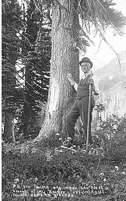 Hazard Stevens and Philemon Beecher Van Trump were the first recorded to reach the summit of Mount Rainier. The two men met in 1867 while Van Trump was employed as the governor's secretary and Stevens was working for the Oregon Steam Navigation Company.[14] They both expressed interest in attempting to summit Mt. Rainier, however, the men were not able to leave for two years because of forest fires in the region.[14] In early August 1870, the men headed west to Yelm Prairie, there they would enlist the help of an experienced guide named James Longmire to lead them to Bear Prairie.[15][14] While they were on the Yelm Prairie, Stevens and Van Trump met Edmund T. Coleman, an experienced mountain climber who agreed to accompany them.[15][16]