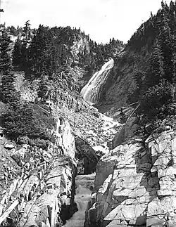 When Stevens, Van Trump, and Sluiskin reached the mountain, at about 6,500 foot elevation they set up a permanent campsite, called Stevens Camp. They named a nearby waterfall Sluiskin Falls after their guide.[15]
