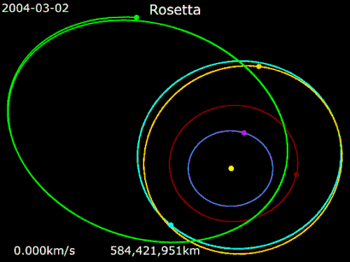 - 4-9 April 2004 — The last instrument on board Rosetta (MIDAS) was turned on during 4 April and commissioning concluded on 9 April. By this point all science and engineering subsystems had been activated at least once.