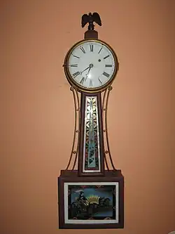 - A banjo clock is a wall clock with an inverted banjo-shaped case. The banjo clock normally lacks a striking mechanism and indicates time only by its hands and dial, for which reason some horologists may insist upon calling it a timepiece rather than a true clock. The clock is usually adorned with a finial on the top. Known as his "patent timepiece", the banjo clock was invented by renowned American clockmaker Simon Willard of Roxbury, Massachusetts, and patented on February 8, 1802.[42][43][44]