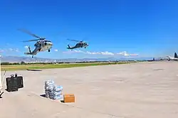 The hospital ship USNS Comfort left the Port of Baltimore on 16 January 2010 bound for Haiti.[60] On 16 January 2010, the guided-missile cruiser USS Bunker Hill headed toward Haiti, part of the US Navy's enlarging sea base directed at implementing disaster relief.[61] Salvage ship USNS Grasp is being dispatched with divers whose task is to assess the Port-au-Prince seaport damage.[62] By 16 January 2010, US military helicopters were airdropping food and supplies to the survivors.[63]
