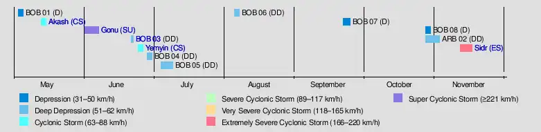 The graphical bar gives a brief overview of storm activity during the season, and a storm's maximum intensity category in terms of wind speed is included as a colour bar. This is given by the IMD's values of maximum 10-minute sustained winds. The colour scheme is detailed to the right.