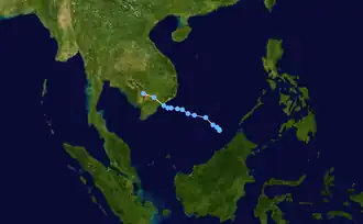 - 06:00 UTC at 13°36′N 117°18′E / 13.6°N 117.3°E — The JMA analyzes the tropical depression in the South China Sea having at 10-minute sustained winds of 30 knots (56 km/h; 35 mph).[6]