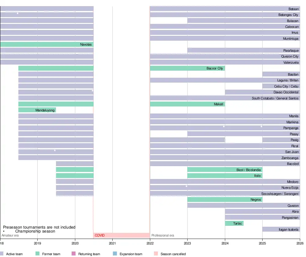 This season featured 29 teams. Two expansion teams joined the league: the Negros Muscovados and the Quezon Huskers.[4] Five teams also made their return: the Bulacan Kuyas, Bicol Volcanoes, Iloilo United Royals, Parañaque Patriots, and Pasay Voyagers. The Rizal Golden Coolers were realigned for the third straight season, moving back to the North Division.[5]