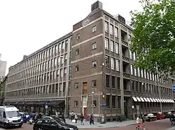 A Stadstimmerhuis (translated literally: "city carpentry house") is the office of the municipal service that deals with building and construction. It is named after the profession of civil carpenter, and later civil architect or master builder. An earlier Stadstimmerhuis in Rotterdam was located on the Haringvliet, but was destroyed in the Second World War during the German bombing of Rotterdam in World War II.[2] Then, from the early 1940s to 1953, the Stadstimmerhuis was located as an emergency building near the cattle market, between the Warande and the Goudse Rijweg, on the Boezemweg. This emergency building was still in use after 1953. In 1947, municipal architect J.R.A. Koops designed the new Stadstimmerhuis, originally conceived as an elongated building on the Haagseveer with four wings at right angles to each other. Ultimately, only one of the four wings was realized: the one on the Meent. In this way, an L-shaped office building was created on the Meent and the Haagseveer. Its construction took place between 1950 and 1953; it was one of the first larger buildings in the empty center of Rotterdam to be erected after the bombing.