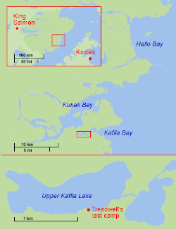 In October 2003, Treadwell and his girlfriend, physician assistant Amie Huguenard (born October 23, 1965, in Buffalo, New York), visited Katmai National Park, which is on the Alaska Peninsula across Shelikof Strait from Kodiak Island. In Grizzly Man, Werner Herzog states that Treadwell had written in his diaries that Huguenard feared bears and felt very uncomfortable in their presence. Her final journal entries indicated that she wanted to be away from Katmai.[12] Treadwell set his campsite near a salmon stream where wild bears commonly feed in autumn. He was in the park later in the year than normal,[4] at a time when bears attempt to gain as much fat as possible before winter. Food was scarce that autumn, causing the bears to be even more aggressive than usual.[1][13]