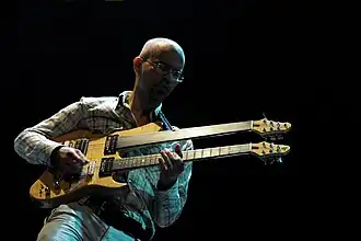 He has developed his own double necked guitar, on which he combines Indian scales and African rhythms with Western jazz improvisation.[3][4] Currently, Şahin is a PhD candidate in composition at New York University.