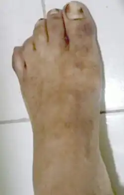 | Symptoms | One or more dark brown/black, painless spots on palms or soles[3] |