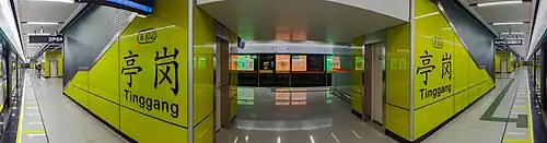 Tinggang Station (simplified Chinese: 亭岗站; traditional Chinese: 亭崗站) is a station of Guangzhou Metro Line 8, located underground on the south side of Hubin South Road, Shisha Road, Baiyun District, Guangzhou, Guangdong Province, China. The station was opened on November 26, 2020 with the opening of the northern extension of Guangzhou Metro Line 8.[1]