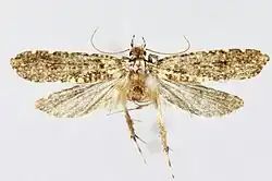 The wingspan is about 20 mm for males. The forewings are yellowish brown mixed with grayish brown, shining bluish violet, with scattered faint white dots, large and conspicuous at the base, along the costa, termen and dorsum. The hindwings are grayish brown, shining bluish violet.