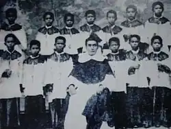 The Tiples de Manila is an all-boy vocal group established in 1587 by Rev. Fr. Pedro Bolaños, O.P., and is currently the oldest existing choral group in the Philippines.[1][3] The word “tiple” in Spanish means the soprano voice of a boy. When members reach the age of puberty, their voices change either to a tenor or a bass. The boys range from 8 years old to 14 and sometimes a little bit older. The group was eventually maintained to sing for the annual celebration of the Feast of Our Lady of the Most Holy Rosary of La Naval de Manila held in October.[1][3][4][5]