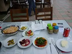 Tire meatballs, which are peculiar to the Tire district of İzmir Province, Turkey, are grilled with a thickness of a pen on thin skewers.[1][2] No spices other than salt are used in its minced meat; and the meatballs are served with a buttery tomato sauce. The essential taste of Tire meatballs is revealed by the village butter used in its sauce. These meatballs, also known as Delikli (drilled) meatballs and Tire Kebab in the public are served by putting fresh parsley on them. Optionally, Tire meatballs may also be served with yoghurt.[3][4]