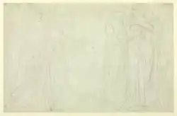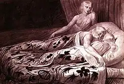 Tiriel is a narrative poem by William Blake, written c.1789. Considered the first of his prophetic books, it is also the first poem in which Blake used free septenaries, which he would go on to use in much of his later verse. Tiriel was unpublished during Blake's lifetime and remained so until 1874, when it appeared in William Michael Rossetti's Poetical Works of William Blake.[1] Although Blake did not engrave the poem, he did make twelve sepia drawings to accompany the rough and unfinished manuscript. However, three of them are considered lost as they have not been traced since 1863.[2]