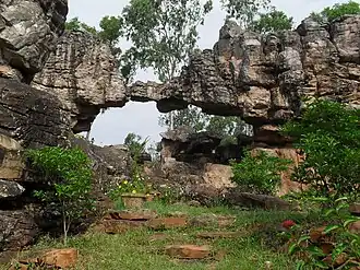 Silathoranam, a natural arch and a distinctive geological feature, is located in the Tirumala Hills at a distance of 1 km (0.62 mi) from Tirumala Venkateswara Temple. The arch measures 8 metres in width and 3 metres in height and is eroded from quartzite of Cuddapah Supergroup of Middle to Upper Proterozoic (1600 to 570 Ma) by weathering agents like water and wind.[35]