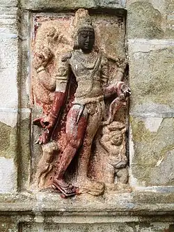 Adhimooleswarar temple complex has two prakarams (outer courtyard) and a small five-tiered rajagopuram (gateway tower). The central shrine faces east and holds the image of Adhimooleswarar (Shiva) in the form of a granite lingam. The granite images of the deities Ganesha (son of Shiva and god of wisdom), Murugan (son of Shiva and god of war), Nandi (the bull and vehicle of Shiva), and Navagraha (nine planetary deities) are located in the hall leading to the sanctum. The hall leading to the sanctum also has the South facing shrine of Nithyakalyani (Parvati), the consort of Adhimooleswarar, in standing posture. As in other Shiva temples of Tamil Nadu, the first precinct or the walls around the sanctum have images of Dakshinamurthy (Shiva as the Teacher), Durga (warrior-goddess), and Chandikeswarar (a saint and devotee of Shiva). There are also images of Bhikshatana, Dakshinamurthy sporting a Veena, and Vishnu. The first precinct is surrounded by granite walls.[2]
