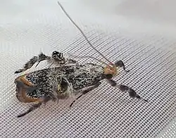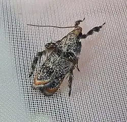 The wingspan is 17–20 millimetres (0.67–0.79 in). The forewings are dark fuscous with two or three short whitish streaks from the base and transverse lines of white irroration (sprinkling) at one-fourth and one-third, partly marked with orange. There are three orange longitudinal streaks from about the middle to three-fourths, the third furcate (forked) posteriorly, separated by streaks of purplish-leaden suffusion. Veins 3, 4, and 7 to 10 are marked more or less completely with white streaks, 5 and 6 with orange streaks and there is a short white streak along the costa near the apex. The hindwings are dark fuscous, with a subdorsal groove enclosing a pencil of whitish-ochreous hairs.[2]