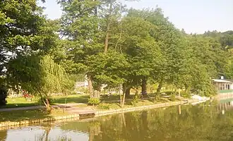 Tivoli Pond is located in the circular plateau of the CR 3/1 (part) Tivoli arrangement area.[8] The area is situated in the southeastern part of Tivoli Park in the immediate vicinity of the Cekin Mansion,[9] along an avenue that was planted in the 1860s.[10][11] On the western bank of the pond, there are two wooden peninsulas, frequently occupied by young people.[12] A cafe operates at the northwestern end of the pond,[13] in a half-wooden half-concrete building of a former changing-area.[4][14][15] It is the only restaurant in this part of the park.[16] On a lawn besides the pond, an open-air library operates in warm weather and a workshop on recycling books and other printed matter, called "The Read Ones."[15][17] There is a small bronze plastic next to the middle of the western bank of the pond, named Ribe ("Fish"). It is a depiction of two vertically standing fish, created by the expressionist sculptor France Kralj in 1935 and put in the pond in 1994.[18] At the northern end of the pond stands a drinking fountain.[19] Access to water is prevented by trees of the species such as the alder, the willow, the hornbeam, and shrubs.[20] In the vicinity,[21] a staircase leads towards Tivoli Castle.[22] On the steep eastern bank right next to the water grows the hornbeam, preventing erosion.[20] On its upper edge, a wooden fence stands and a barberry hedge has been planted.[20] Besides it, there is a footpath.[20] Next to it, a children's playground has been arranged.[7] On the southern bank, there are a concrete bank, two wooden peninsulas, marsh plants and climbers, a wooden fence and a paved lookout plateau behind it.[23] There are also some shrub species.[20]