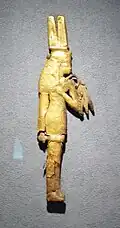 Following the move of the capital back to Thebes, Tiye, along with others buried in the royal tomb, were transferred to the Valley of the Kings. The presence of pieces of one of her gilded burial shrines in KV55 indicate she was likely interred there for a time.[21] Provisions had been made during the reign of her husband Amenhotep III for her burial within his tomb, WV22. Shabti figures belonging to her were found in this tomb.[22]