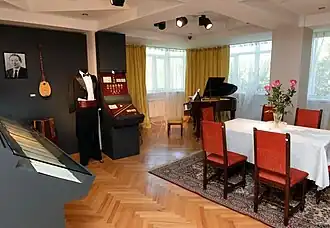 The apartment has been preserved and recreated as it was Tlendiev's lifetime. The museum has four rooms, with the displays arranged in chronological order - the entrance hall - childhood and adolescence, living room – creations and acquaintances, work hall – musical heritage, kitchen and recreation room – photos of family, gifts and souvenirs.[6]