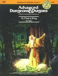 C4 To Find a King was written by Bob Blake, with a cover designed by Keith Parkinson and interior illustrations by Ron Randall.[2] It was published by TSR in 1985 as a 32-page booklet with two outer folders.[2] To Find a King was used as the AD&D tournament module at Gen Con XVI,[2] as a four-round competition module. The C in the module code represents the first letter in the word competition, the name of C1–C6 module series.[3]