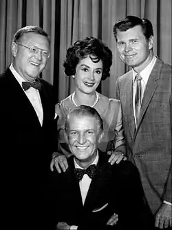 The original daytime panel with Bud Collyer. From left: Sam Levenson, Mimi Benzell, and Barry Nelson. The fourth panel member was Sally Ann Howes.