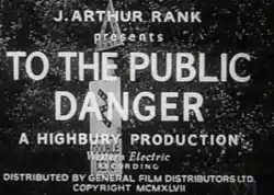 To the Public Danger is a 1948 British drama short film directed by Terence Fisher and produced by John Croydon. It stars Dermot Walsh, Susan Shaw, Barry Letts, and Frederick Piper.[1]