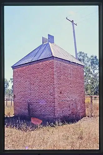Although the external furnace area of the kiln has at some stage been dismantled and filled in, it can be located on the eastern side where ground subsidence reveals a round flue outlet. This is 1.5 metres (4 ft 11 in) from the northern edge of the building with 4.18 metres (13.7 ft) between the top of the brick wall and the top of the outlet. The diameter of the outlet is approximately 30 centimetres (12 in). The corrugated roof sheeting at the centre of the eastern wall has been cut back in two places and the metal in between bent down, indicating the former position of the chimney. A flat piece of iron attached to the left of this is probably the remains of a holding bracket for the chimney. Looking inside through the broken bricks on the western wall, it is possible to see a second matching flue outlet at a corresponding distance from the southern edge of the building. At a lower level, between these round outlets and the northern and southern walls, are two square holes indicating the flue inlets. Although no longer attached to the inlets and outlets, the remains of two iron flues still lie on the dirt floor, running across the barn and back again. They appear to be made out of iron sheeting fashioned into round pipes with telescopic sleeves joined to form the returns. Some remnants of timber tiers are also evident, mainly along the northern wall. These tiers are made of bush saplings.[1]