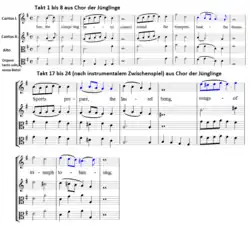 Handel's music is a chorus with short lines, sung in homophony.[2] It is written in march rhythm and harmonic simplicity. In Handel's works, the first of three stanzas is scored for three voices, two sopranos and an alto, accompanied by two horns and organ. A second stanza with different text is written for two sopranos, two flutes and organ. Finally, the third stanza, with the text of the first, is sung by four choral parts and a rich basso continuo in dramatic development. Ranke used only the four-part setting, which he modified slightly.[2]