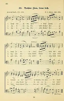 "Tochter Zion, freue dich" (Daughter Zion, rejoice) is an Advent song in German. The text was written by Friedrich Heinrich Ranke, based on music derived from two of Handel's oratorios. The song was published in 1826, assigned to the Entry into Jerusalem. The hymn is part of the German Protestant hymnal Evangelisches Gesangbuch as EG 13 and the 2013 Catholic hymnal Gotteslob as GL 228, both four-part settings in the Advent section.