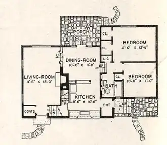 Tibbals firm designed nine homes which were replicated throughout the Colonial Hills and Dales subdivision in Worthington, Ohio in 1942, a pioneering suburban development funded by the Defense Homes Corporation. This was a major commission for the 30-year-old architect.[2] In 1945, he renamed the firm to Tibbals, Crumley and Musson with new partner George Crumley.[4]